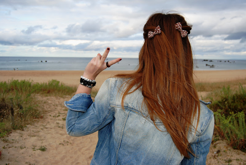 me encanta la camiseta y los lazitos en el pelo :) y de fondo esa playa!!
